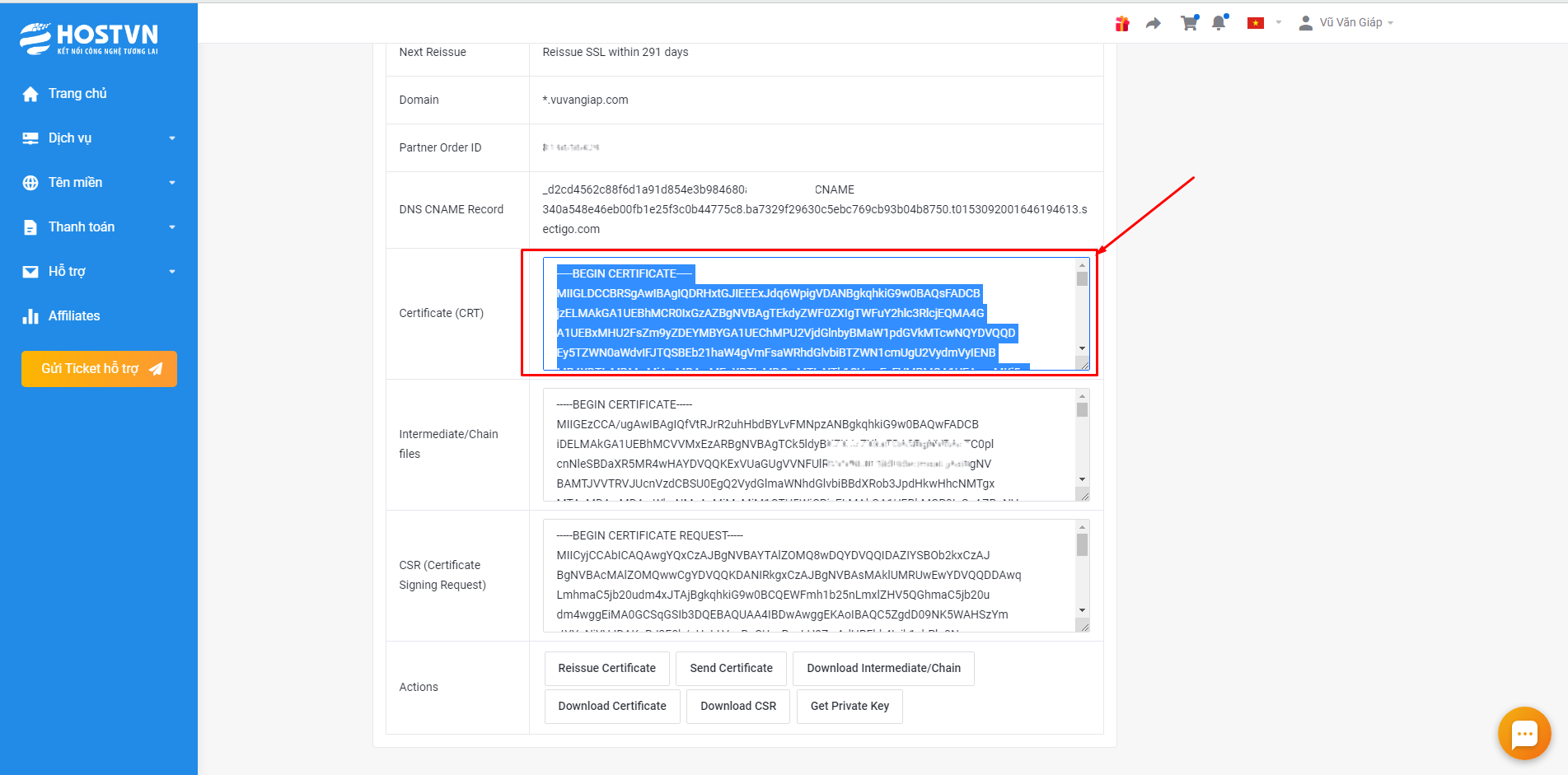 Mã CRT các bạn lấy ở trang quản lý dịch vụ như hình sau: